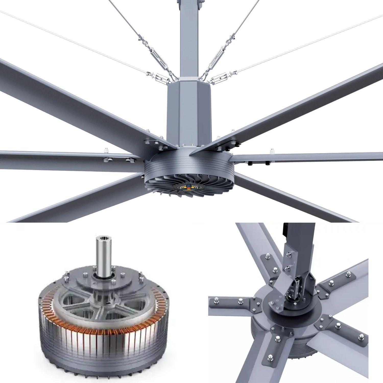El ventilador de techo industrial opera con un eficiente motor síncrono de imán permanente (PMSM) de estándar IE5, proporcionando un par de 260 N·m (con un máximo de 468,8 N·m) y logrando un ahorro energético superior al 30 %. Con diámetros disponibles entre 3 m y 7,3 m, velocidad del viento de 1 a 5 m/s, cobertura de hasta 1700 m² y un mantenimiento mínimo, garantiza una vida útil estimada de 20 años.